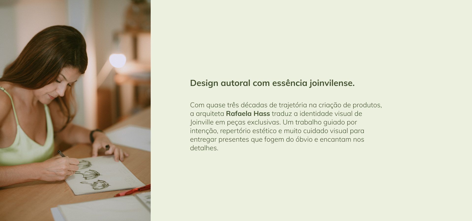 Por trás da JoinViva está Rafaela Hass, arquiteta e criadora da marca, que encontrou no design uma forma de traduzir a identidade joinvilense em produtos que encantam, representam e criam conexão. Com um olhar atento para estética, sensibilidade e propósito, a JoinViva surgiu como uma forma de oferecer peças que vão além do comum e carregam história em cada traço.